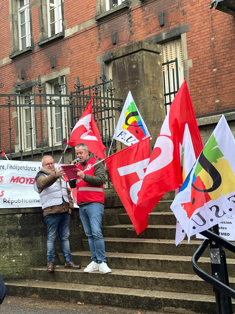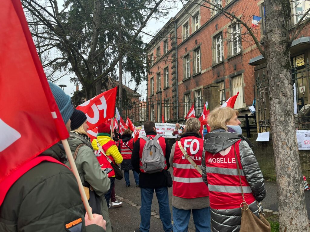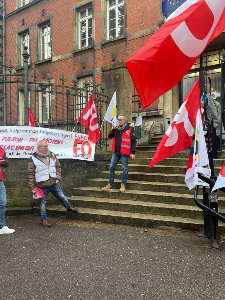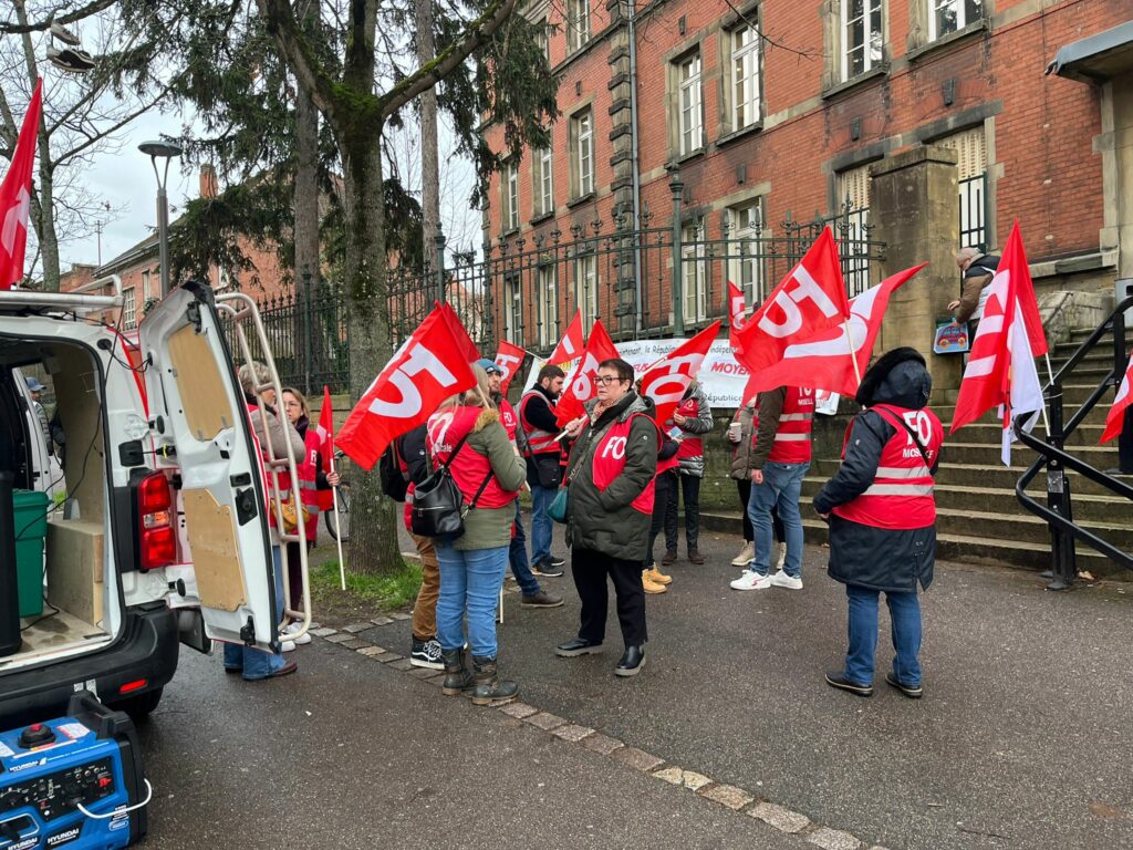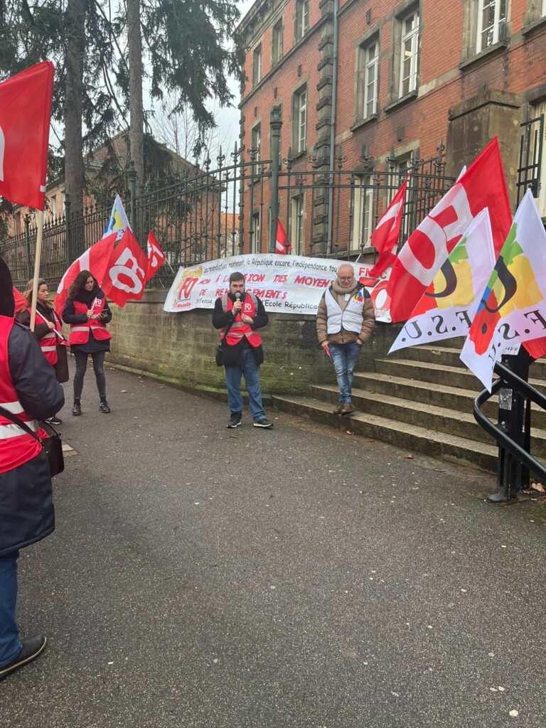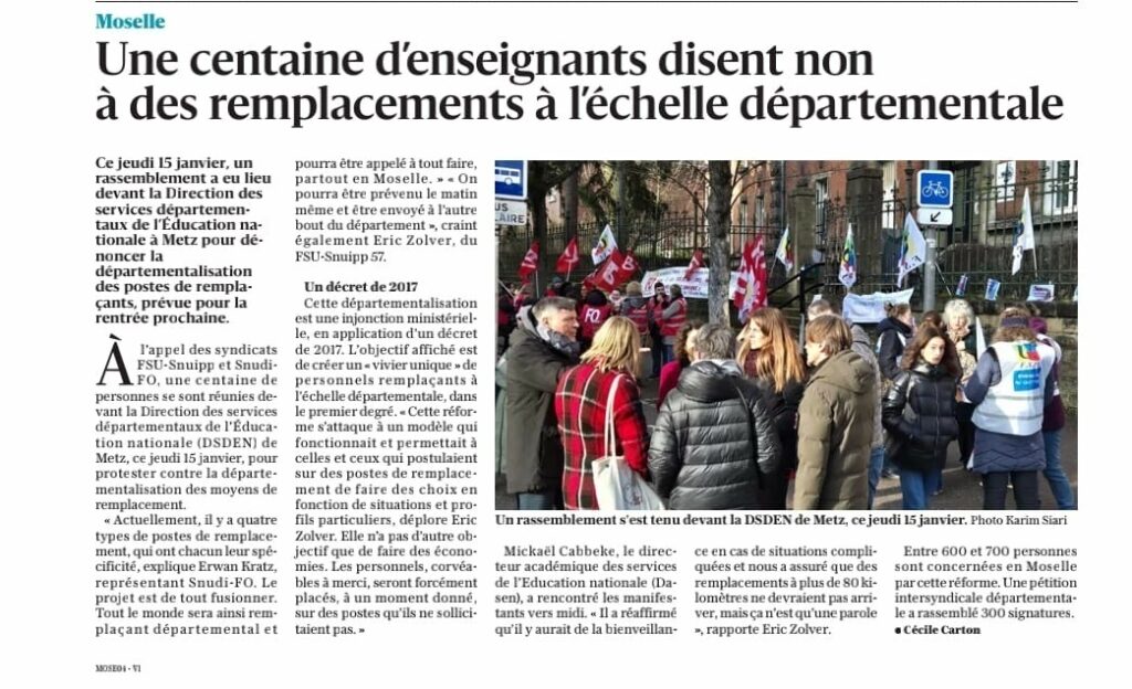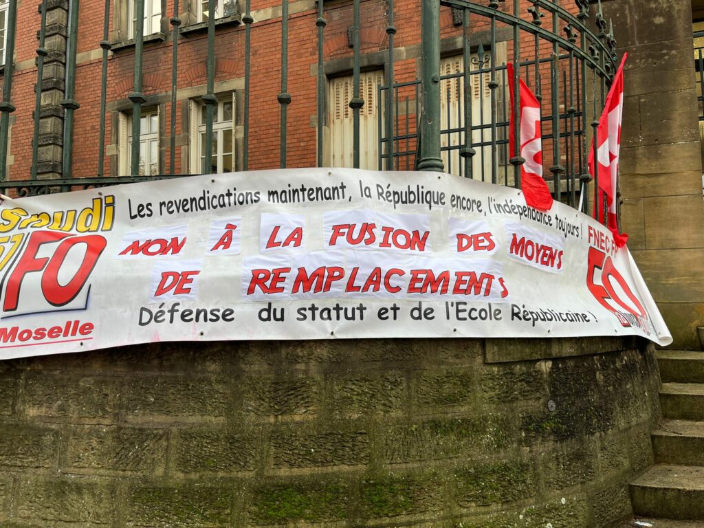 Jeudi 15 Janvier, le SNUDI FO 57 se tenait aux côtés des remplaçants (TMBD, ZIL, ZDA,…) afin de refuser la départementalisation des moyens de remplacements, un sujet d’une importance cruciale pour l’avenir des professionnels de l’éducation. Il s’agit de notre deuxième rassemblement sur ce sujet devant la DSDEN 57, là où nous avons exprimé une fois de plus notre détermination et notre unité face à des décisions qui pourraient gravement affecter le fonctionnement de nos établissements scolaires. L’administration restant sourde à nos revendications sur le sujet, elle n’a fait qu’amplifier la colère des personnels, qui se sentent de plus en plus démunis et méprisés. En effet, elle n’apporte pas de réponse concrète à leurs questions sur l’avenir de leurs postes, comme lors du webinaire organisé sur le sujet, où, malheureusement, l’administration a coupé court à de nombreuses interventions, laissant ainsi de nombreuses questions en suspend, ce qui ne fait qu’ajouter à la frustration et au sentiment d’abandon ressenti par les professionnels concernés.